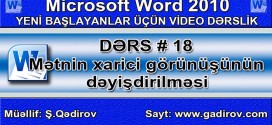 Microsoft Word 2010 proqramına həsr olunmuş növbəti video dərsliyimdə sizləri salamlayıram. Bu sayca qələmə aldığım on səkkizinci video dərslikdir. Əvvəlki video dərsimdə qeyd etdiyim kimi biz artıq formatlaşdırma ilə bağlı dərslərə başlamışıq. Xüsusən mətnin formatlaşdırılması anlayışını mən bir neçə video dərsdə şərh edəcəm. Çünki formatlaşdırma istər mətnə, istər abzasa, cədvələ, cədvəl daxili elementlərə eləcə də gələcəkdə işləyəcəyimiz qrafik və sxemlərə də aiddir.
