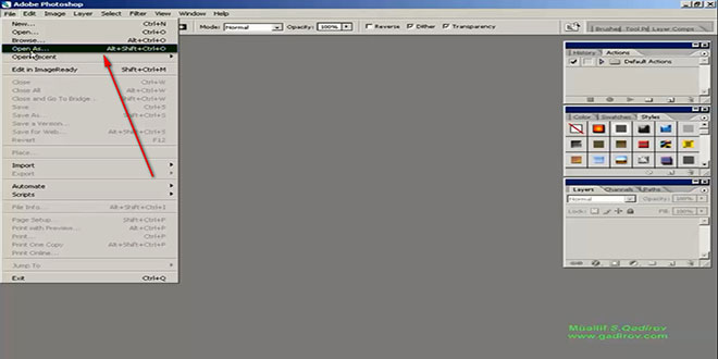 Salam əziz dostlar,dəyərli oxucularım və dinləyicilərim, həmçinin gadirov.com saytının daimi ziyarətçiləri, youtube abunəçilərim və sosial şəbəkə istifadəçilərim. Xoş gördük sizləri. Adobe Photoshop proqramına həsr olunmuş növbəti video dərslikdə salamlayıram. Bu gün ki video dərsimizin mövzusu File menyusu olacaq. Əvvəlki video dərsimizdə biz Adobe Photoshop proqramının interfeys elemenləri haqqında məlumat verdik. Bildirdik ki, menyu sətri Adobe Photoshop proqramının interfeysinə aid olan elementlərdən biridir. Belə qərara gəldik ki, bu video dərsimizdə File menyusunu təşkil edən funksiyaları izah edək. Məlumdur ki, File menyusu fayla aid olan bir sıra əməliyyatları yerinə yetirir. Əvvəlcə File menyusuna müraciət edək. Bunun üçün siçanın göstəricisini File sözü yazılan hissəyə yaxınlaşdırıb bir dəfə klik edək.