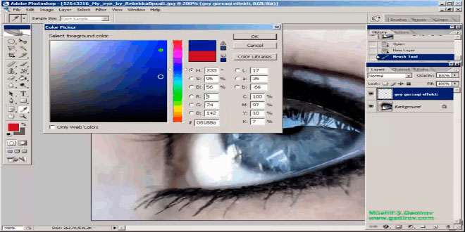 Beləliklə göy qurşağı effektinin yaradılması üçün tələb olunan rəngləri seçib onları göz bəbəyində brush aləti ilə çəkirik.