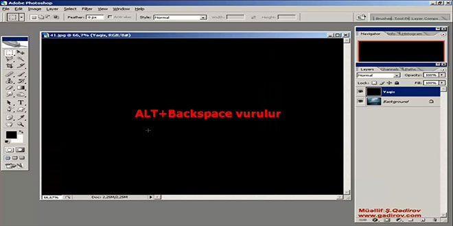 Lakin biz bu layeri qara fonla doldurmalıyıq. Bunun üçün ilk növbədə alətlər qutusundan qara rəngi əsas rəng kimi müəyyən etməliyik.