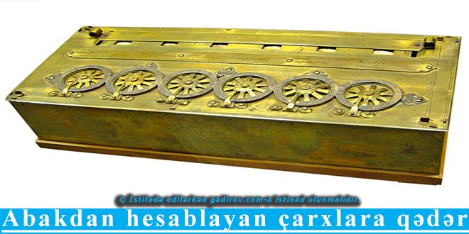 Salam əziz dostlar, dəyərli oxucularım və dinləyicilərim, həmçinin gadirov.com saytının daimi ziyarətçiləri, YouTube abunəçilərim və sosial şəbəkə istifadəçilərim. Xoş gördük sizləri. 1642-ci ildə məşhur fransız alimi Blez Paskal ilk hesablama maşınını yaratdı. Hesab əməllərini yerinə yetirmək üçün Paskal abak lövhəsində daşları saymaq əməliyyatını dişli çarxların öz oxu ətrafında fırlanması prinsipi ilə əvəz etdi. Yəni Paskal çarxların üzərində rəqəmləri ifadə edən bölgülər düzəltdi; hər bölgüdə bir rəqəm.
