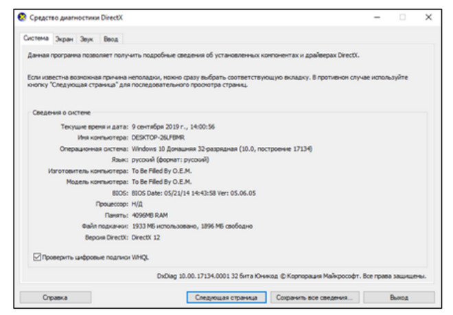 Kompüterinizin bütün texniki xüsusiyyətlərini görmək üçün “dxdiag” yardımçı proqramından istifadə edin. “WIN + X” düyməsini basın “Выполнить” sətrinə “dxdiag” əmrini daxil edin.