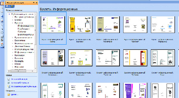 Ekranın solunda əks olunan New Publication- Новая Публикация-Yeni nəşrlər tapşırıqlar panelində nəşr növləri siyahısından Publications for Print- Публикация для печати- Çap üçün nəşrlər qrupunu, sonra isə Brochures-Bukletlər- növünü seçin. Bu zaman pəncərənin sağ hissəsində informasiya bukletlərinin müxtəlif şablonları əks olunacaq.