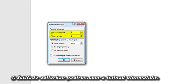 Beləki Размер Таблицы—Cədvəlin ölçüləri , yəni cədvəlin ölçüləri adlanan bölmə vasitəsilə biz quracağımız cədvəlin sətr və sütunlarının sayını təyin edə bilərik. Adi vəziyyətdə susma vəziyyətinə görə məhz sütunların sayı 5, sətirlərin sayı isə 2 göstərilir və biz bu ardıcıllığı pozmağa yəni yeni quracağımız cədvəl üçün sətir və sütunların sayını təyin etməyə çalışaq. Bunun üçün siçanın göstəricisini həmin xana üzərində bir dəfə sıxaq və beləliklə aktivləşən kursor vasitəsilə klaviaturadan Backspace düyməsi vasitəsilə həmin rəqəmi silək və quracağımız cədvəlin sütunlarını təyin edək . (Məsələn; bizim nümunəmizdə 7 sütun ) Daha sonra Число строк-Sətirlərin sayı yəni sətirlərin sayı adlanan sahədə iki rəqəmini silmək üçün yenidən kursoru ora yerləşdirək və klaviaturadan Backspace düyməsini sıxaq. Beləliklə iki rəqəmi silindi və quracağımız cədvəl üçün sətirlərin sayını müəyyən edək. Bizim nümunədə bu 10 olacaq yəni 10 rəqəmini bura daxil edək.